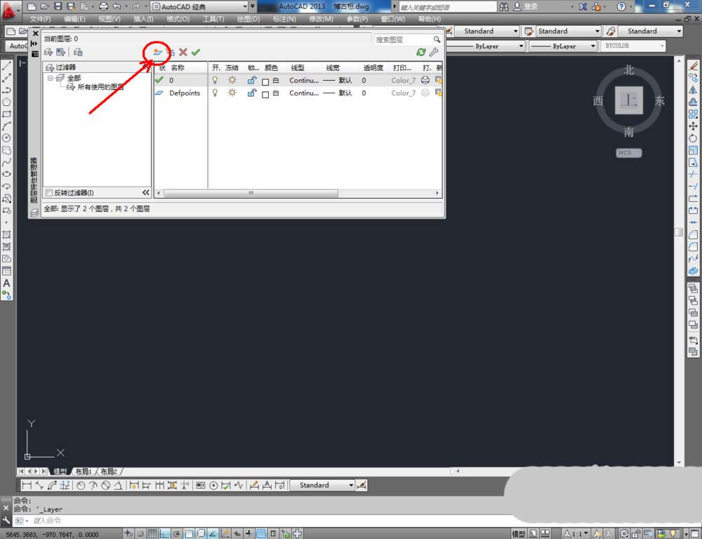 1、打开AutoCAD 2013软件,点击【图层特性管理器】,点击【新建图层】,将图层命名为:博古柜。点击色块,按图示设置一个图层颜色,完成博古柜图层的设置(如图所示);