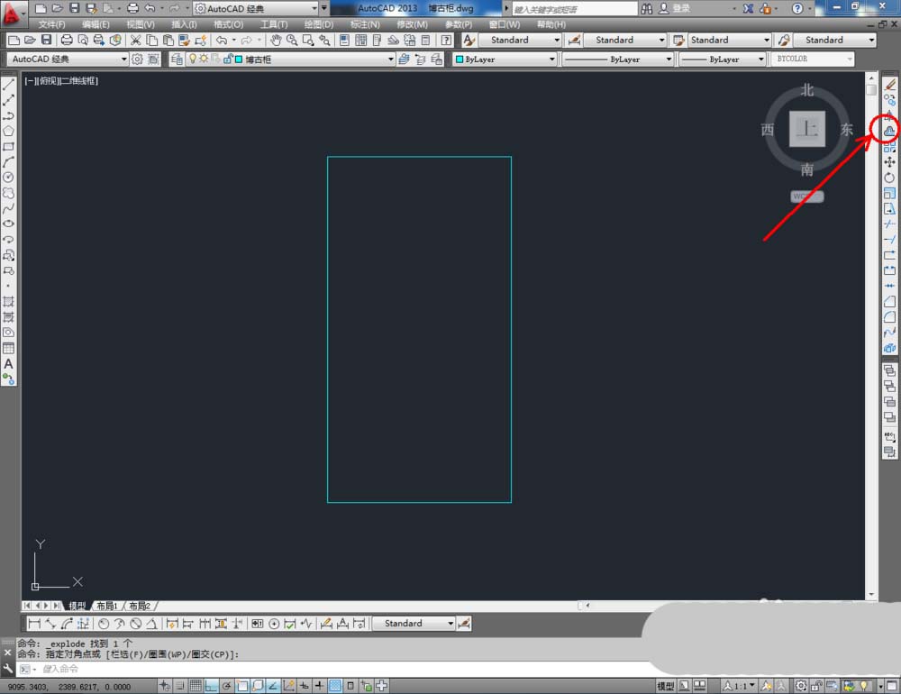 2、点击【矩形工具】,按图示在命令栏输入:d并按下空格键,输入长度数值:1250并按下空格键,继续输入宽度数值:2350并按下空格键,完成矩形图案的绘制。选中图案,点击右边工具栏中的【分解工具】,将图案炸开(如图所示);