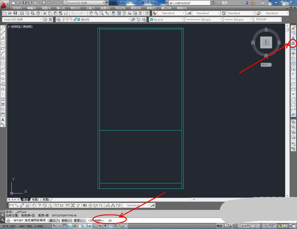 3、点击右边工具栏中的【偏移工具】,在命令栏输入偏移数值:25后,按图示对侧边进行向内偏移。同样的步骤,按图示对图案横边进行偏移操作后,点击【修剪】,剪掉图示图案上的小线段(如图所示);