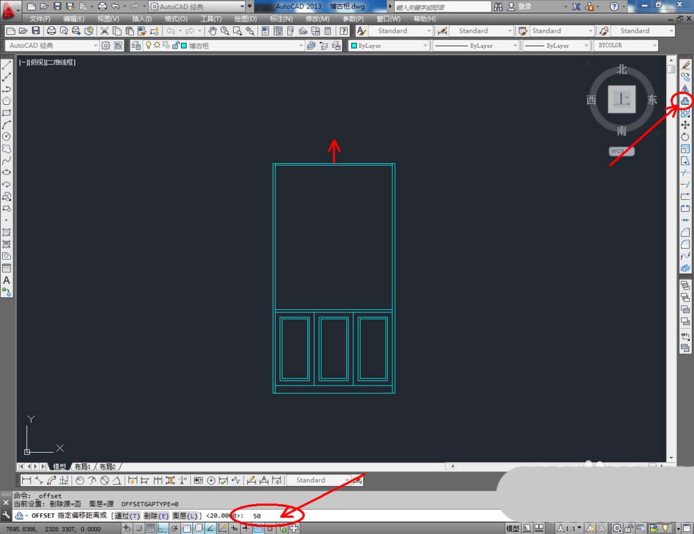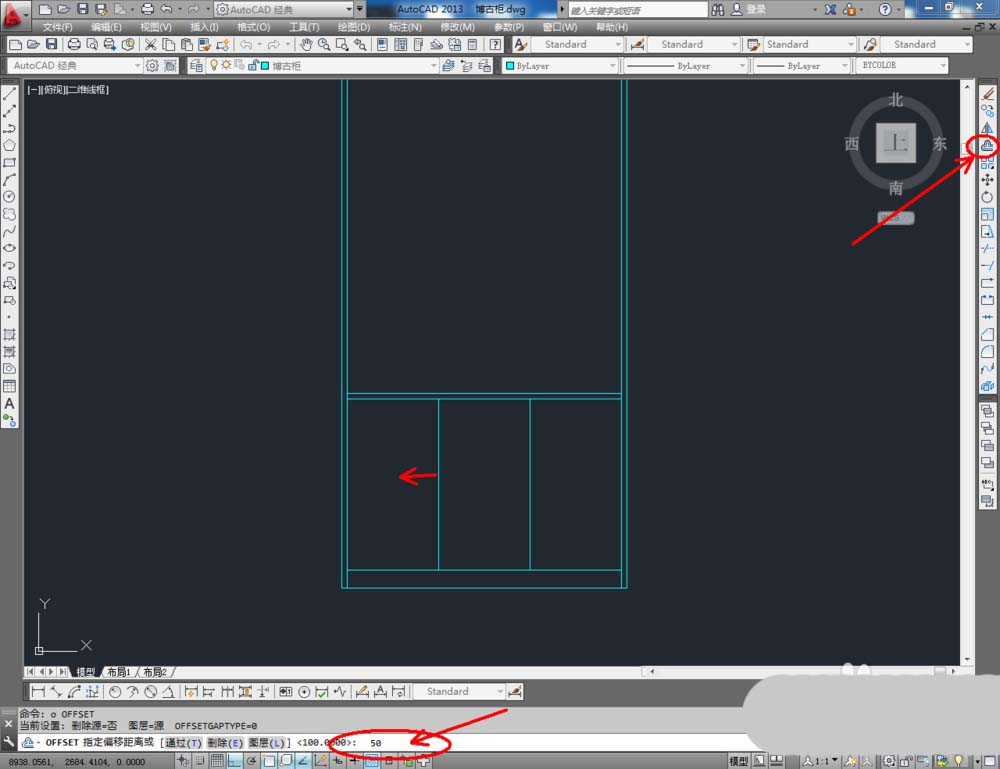 6、点击【偏移】,在命令栏中输入偏移数值:50,对图案顶线进行向上偏移。完成后,调整好两条侧边的长度。点击【直线工具】,按图示绘制出几组线段,制作出博古柜层板部分的造型后,将制作好的拉手导入到文件中并调整好拉手的位置,这样我们的博古柜平面图便全部制作完成。