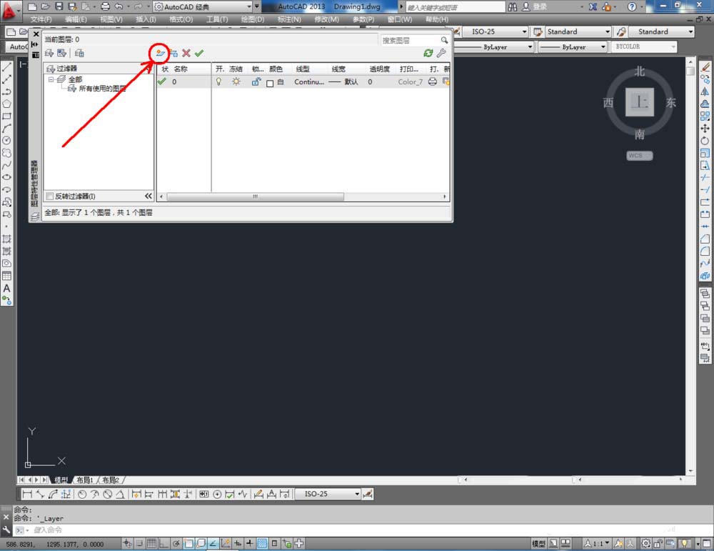 1、打开AutoCAD 2013软件,点击【图层特性管理器】,点击【新建图层】,将图层命名为:衣柜。点击色块,按图示设置一个图层颜色,完成衣柜图层的设置(如图所示);