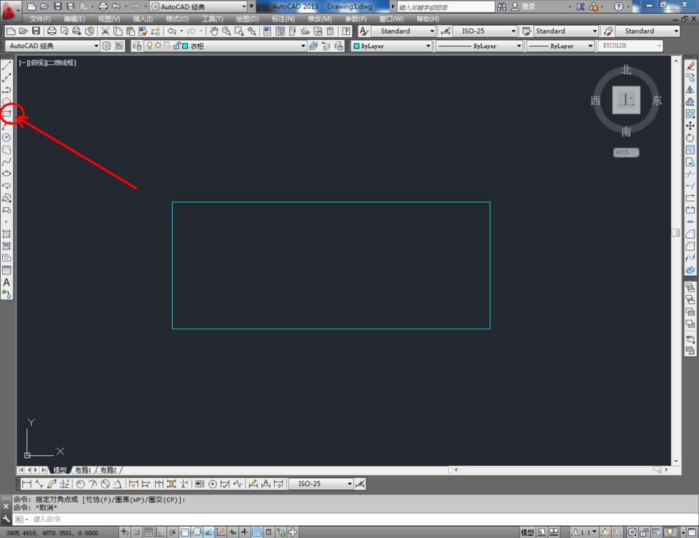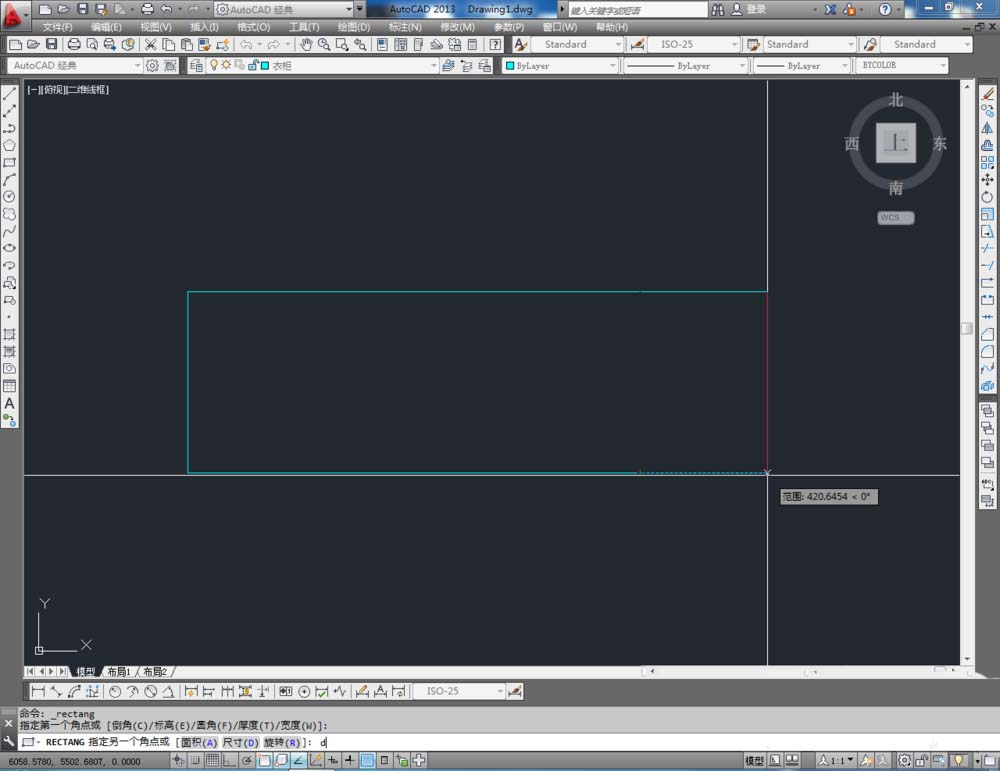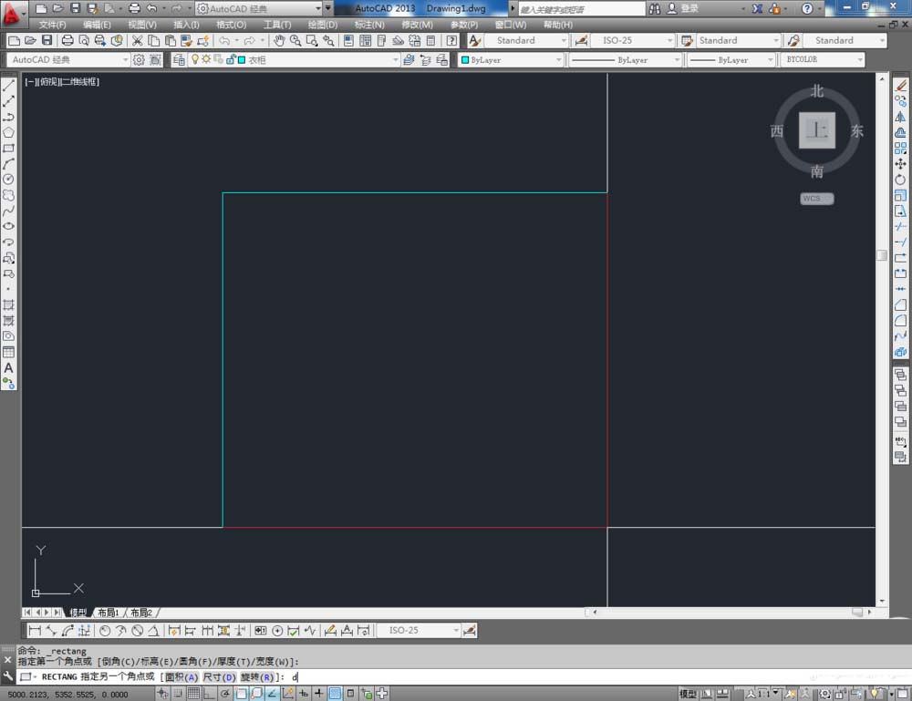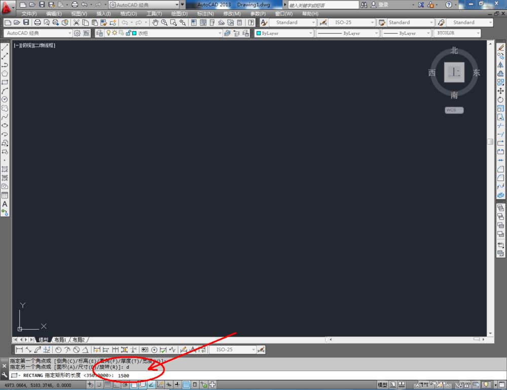 2、点击【矩形工具】,按图示在命令栏输入:d并按下空格键,输入长度数值:1500并按下空格键,继续输入宽度数值:60 0并按下空格键,完成矩形图案的绘制(如图所示);