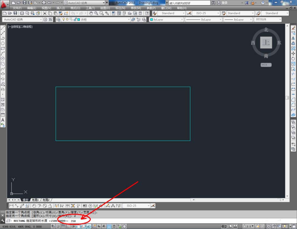 3、点击【矩形工具】,按图示在命令栏输入:d并按下空格键,输入长度数值:350并按下空格键,继续输入宽度数值:60 0并按下空格键,完成矩形图案的绘制(如图所示);