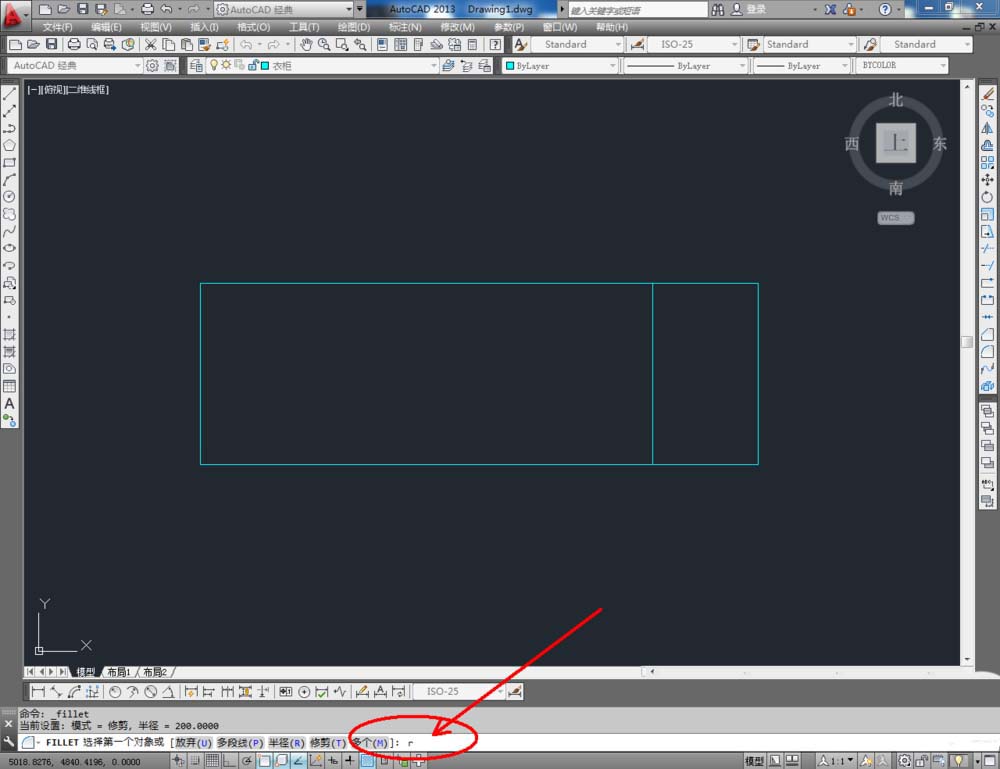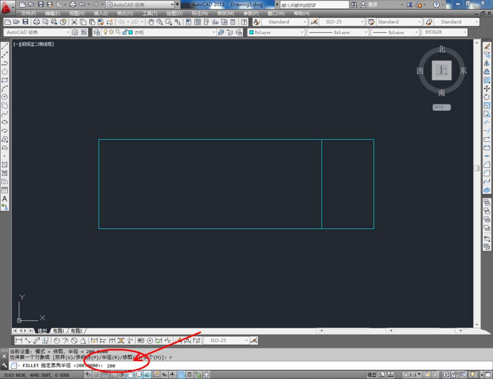 4、点击右边工具栏中的【圆角工具】,在命令栏中输入:r并按下空格键,继续如何数值:200并按下空格键确定,鼠标按图示拾取图案上相邻的两条线段进行圆角处理(如图所示);