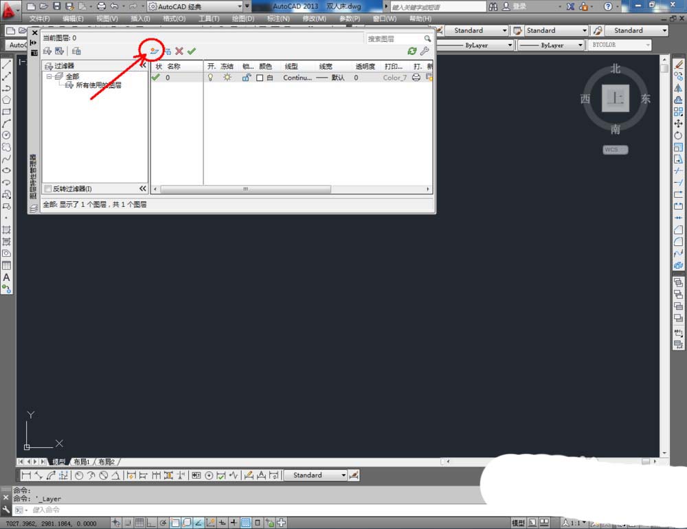 1、打开AutoCAD 2013软件,点击【图层特性管理器】,点击【新建图层】,将图层命名为:双人床。点击色块,按图示设置一个图层颜色,完成双人床图层的设置(如图所示);
