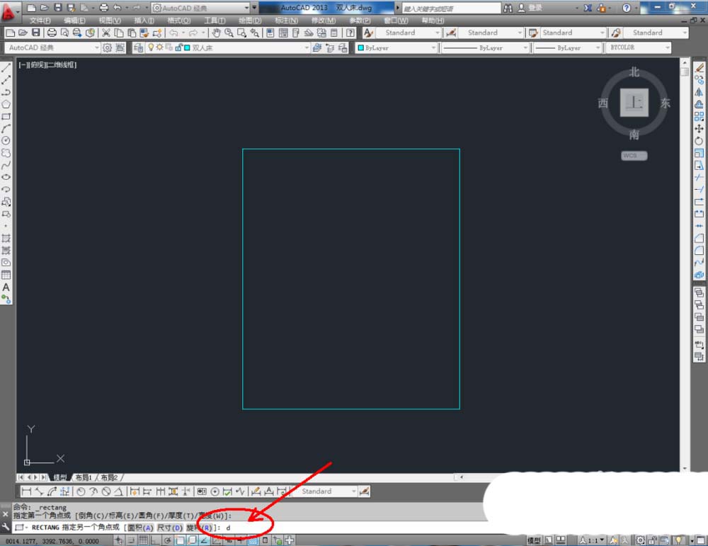 2、点击【矩形工具】,按图示在命令栏输入:d并按下空格键,输入长度数值:1800并按下空格键,继续输入宽度数值:210 0并按下空格键,完成矩形图案的绘制(如图所示);