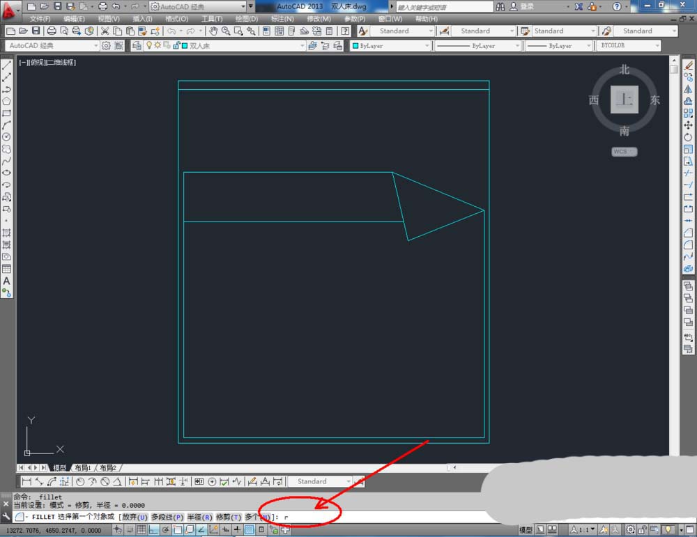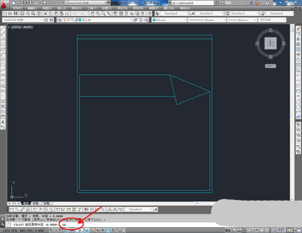 4、点击右边工具栏中的【圆角工具】,在命令栏中输入:r并按下空格键,继续如何数值:50并按下空格键确定,鼠标按图示拾取图案上相邻的两条线段进行圆角处理。同样的步骤,完成另外一边台角的圆角处理(如图所示);