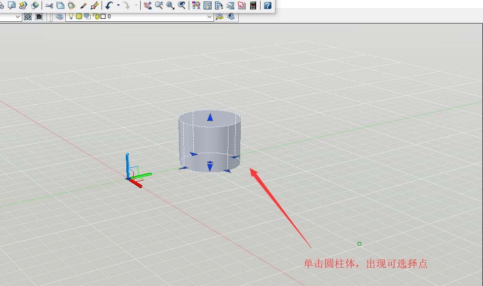 2、绘制圆柱体后,选择圆柱体,出现蓝色点,如图所示。