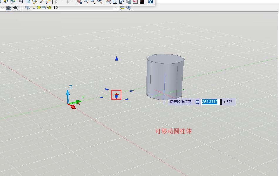 4、单击下表面中间蓝点,可移动圆柱体,如图所示。