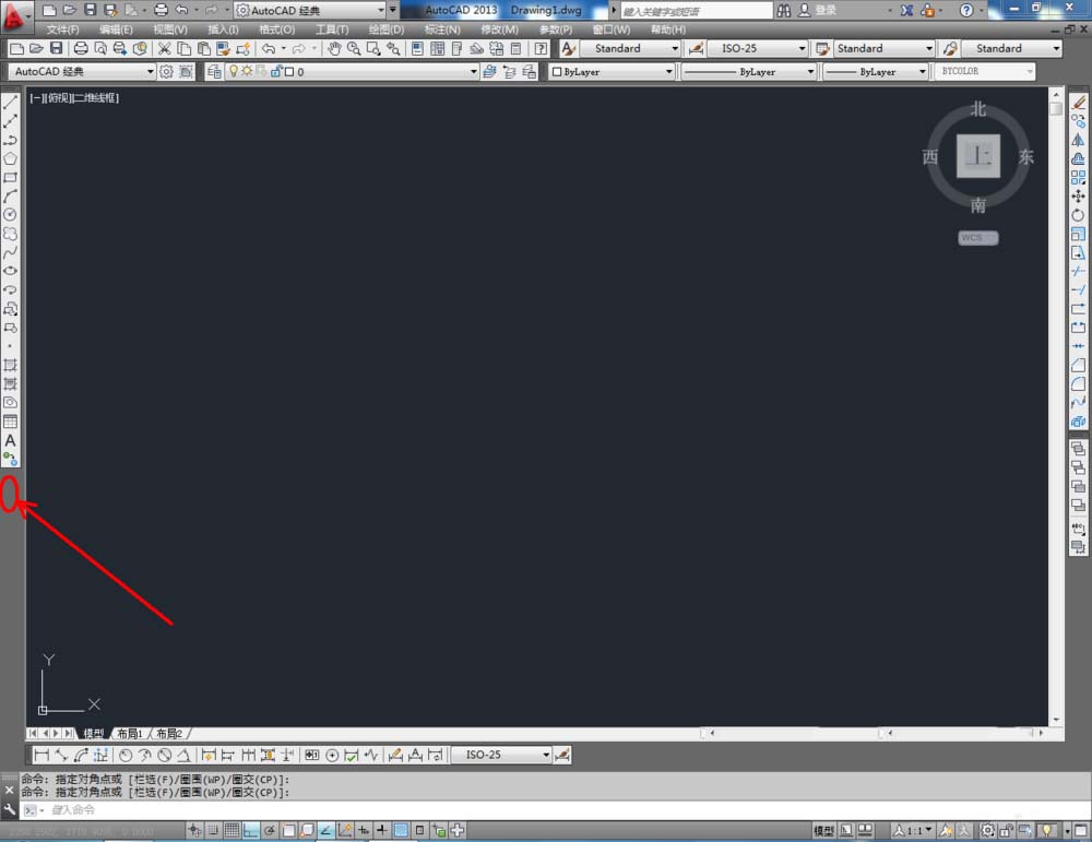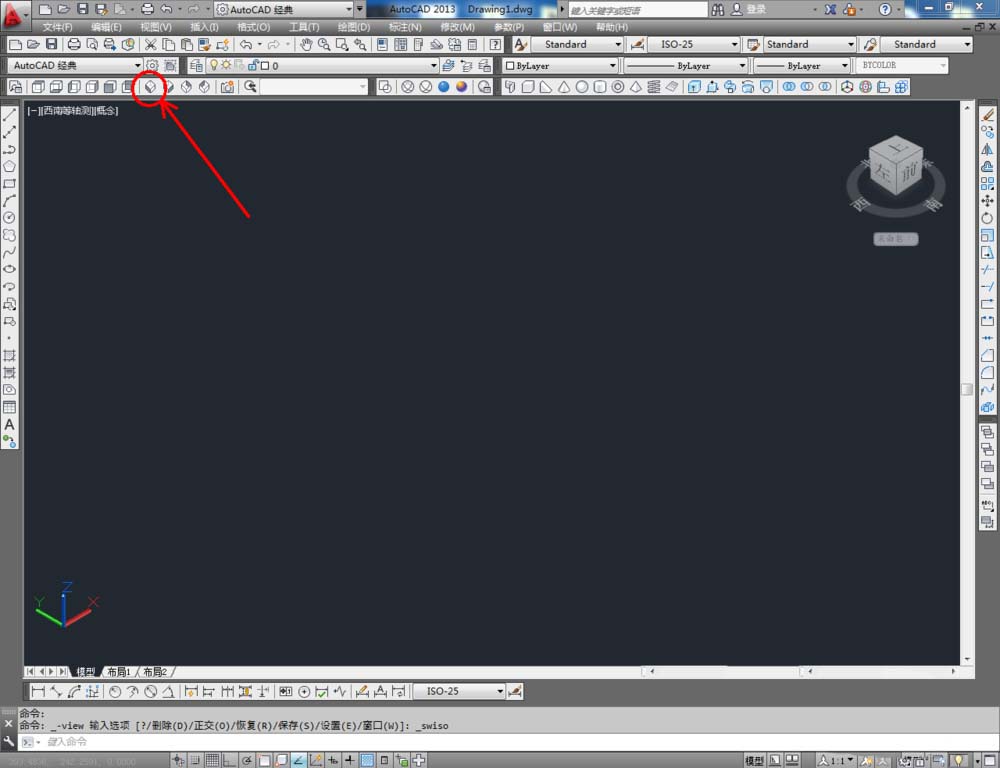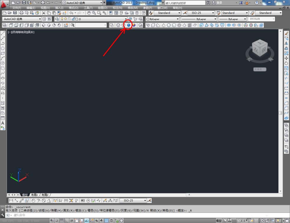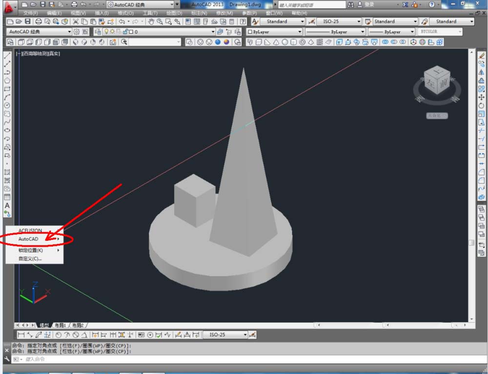 1、打开AutoCAD 2013软件,鼠标移动到图示区域,点击鼠标右键-【AutoCAD】,勾选【建模】、【视图】和【视觉样式】,将这三个工具栏调出并按图示调整好工具栏的位置;