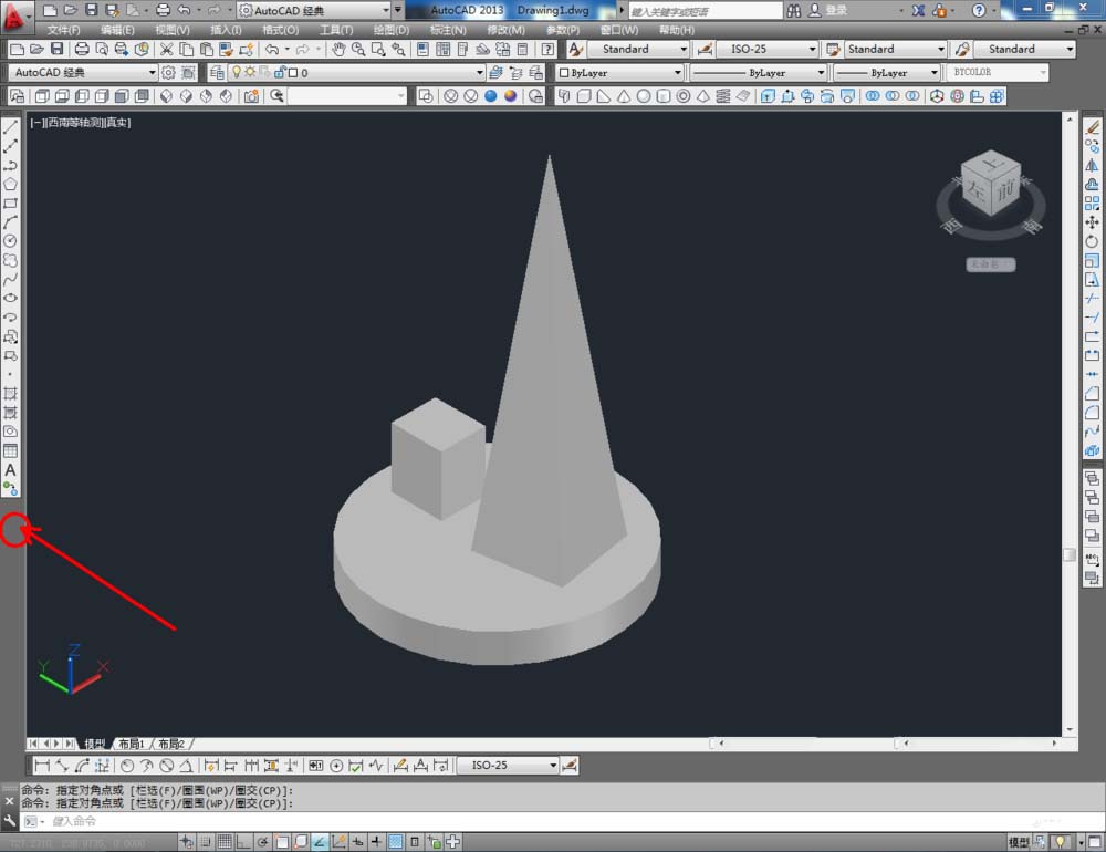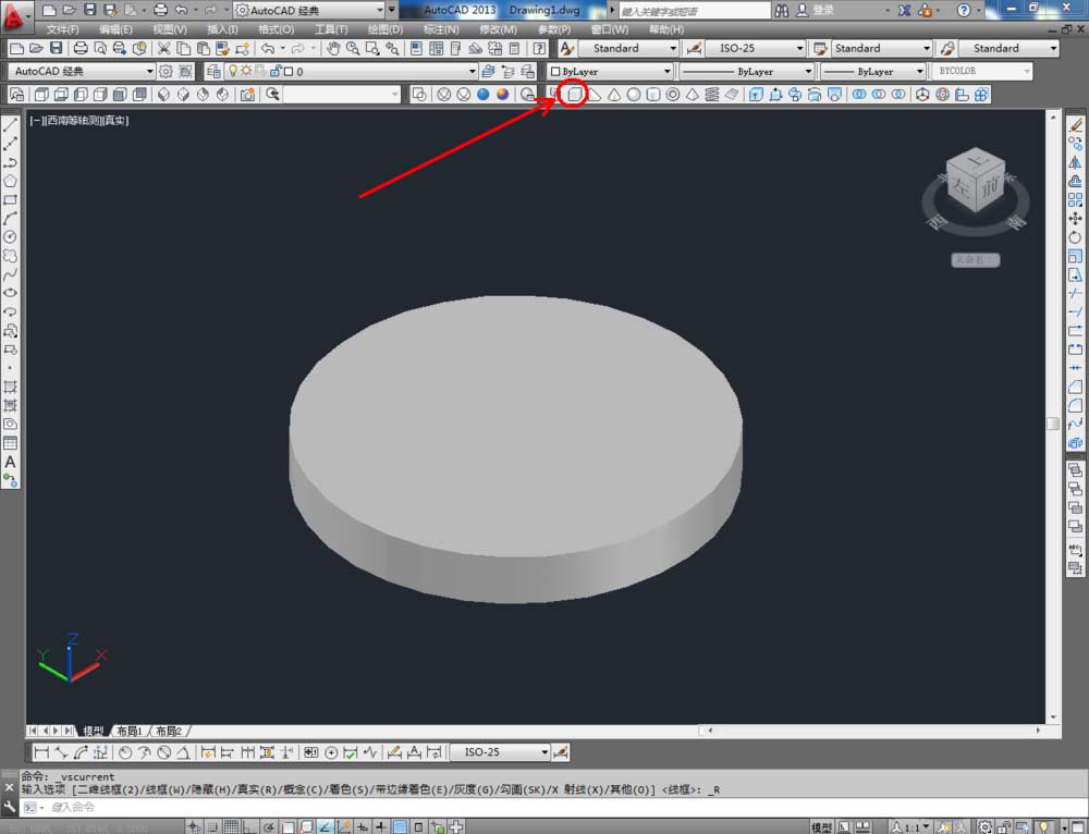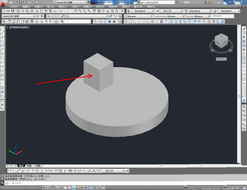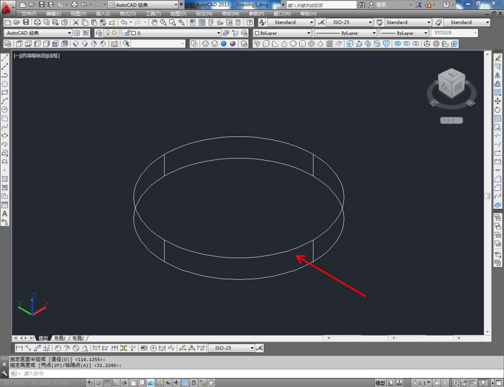 2、点击视图工具栏中的【西南等轴测】将视图切换到西南视图界面,点击建模工具栏中的【圆柱体】工具,按图示绘制一个圆柱体模型(如图所示);