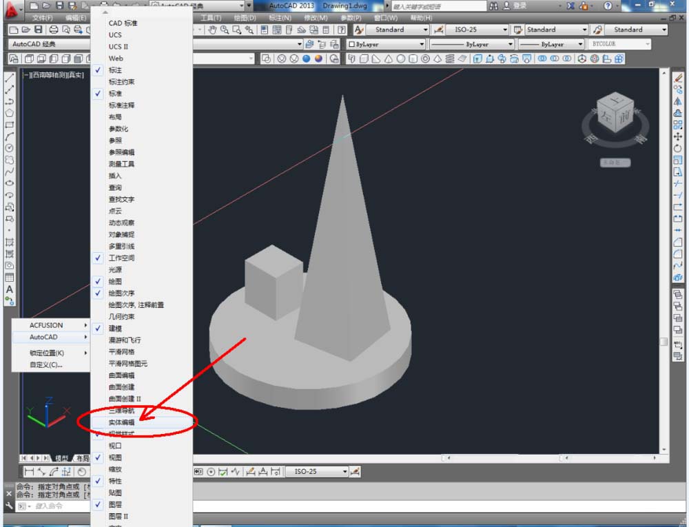 4、点击鼠标右键-【AutoCAD】,勾选【实体编辑】,将实体编辑工具栏调出并调整好实体编辑工具栏的位置(如图所示);