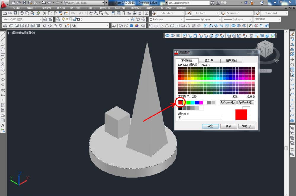 5、点击实体编辑工具栏中的【着色面】工具,拾取图示模型上的面并按下空格键确认,弹出色彩选择框后,选择红色并点击【确认】,完成选面的着色操作。同样的步骤,依次完成其余各面的着色操作。以上就是有关cad如何使用实体编辑着色面工具的所有介绍。