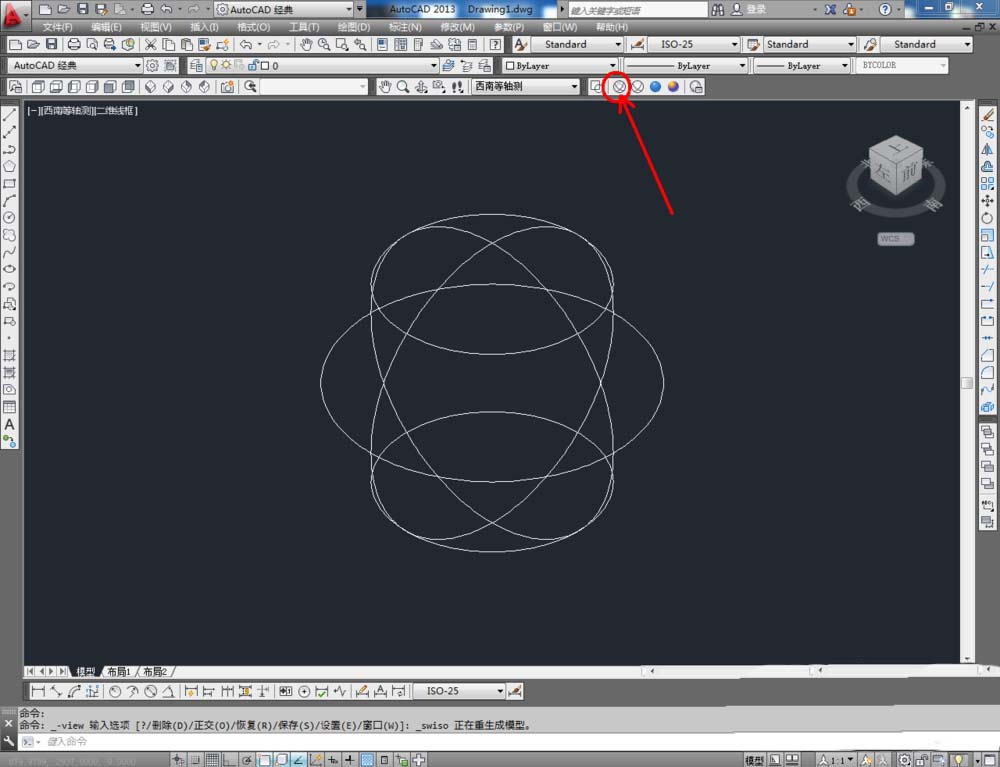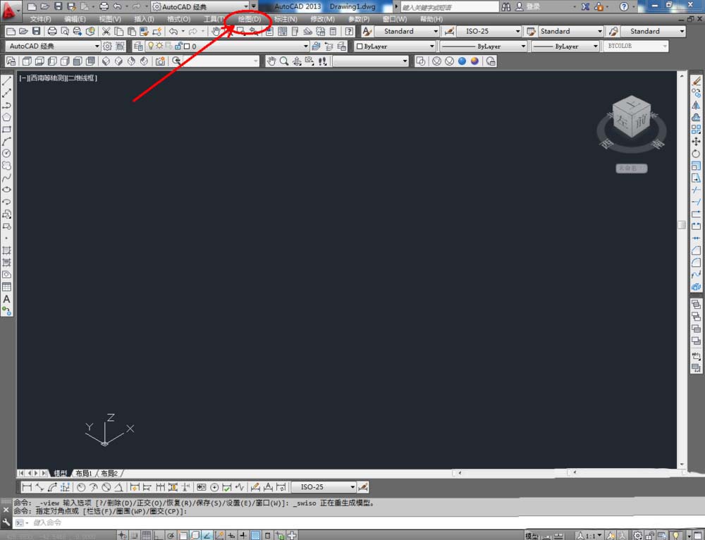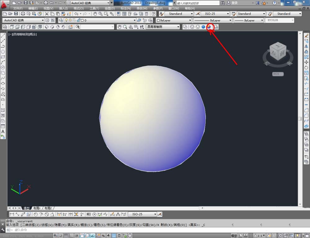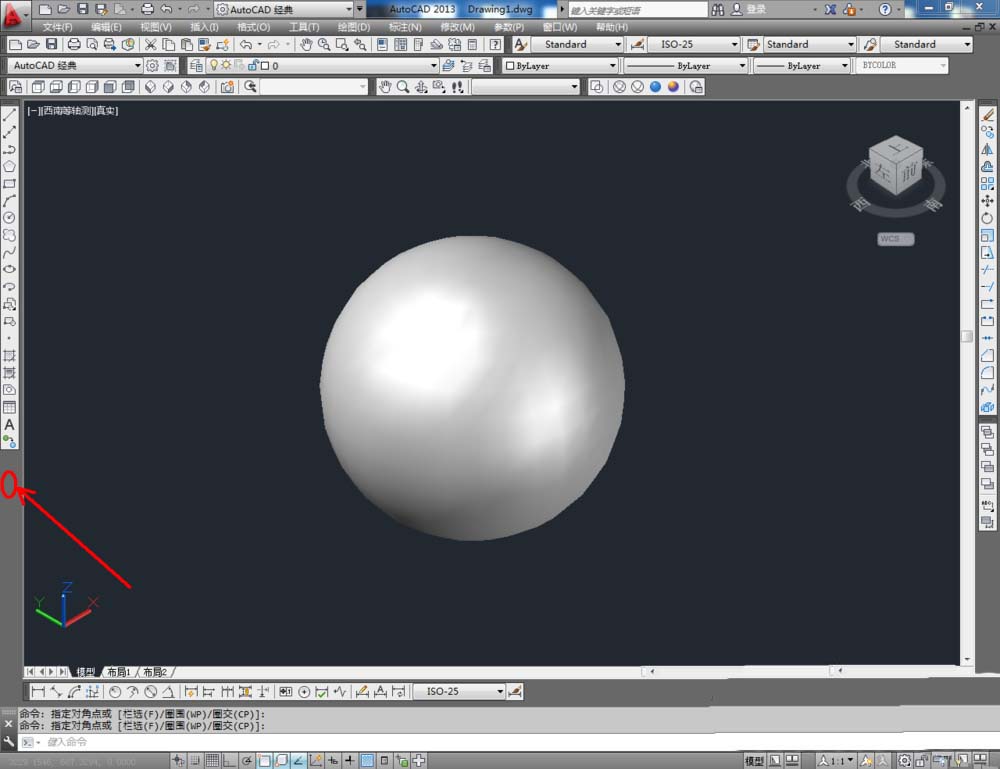 2、点击【绘图】-【建模】-【圆锥体】,按图示在作图区域绘制一个球体模型。完成后,点击视图栏中的【西南等轴测】将视图切换为西南视角并观察球体模型(如图所示);