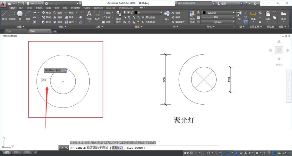 3、与步骤二一样关键要同圆心,画一个半径为250的圆。