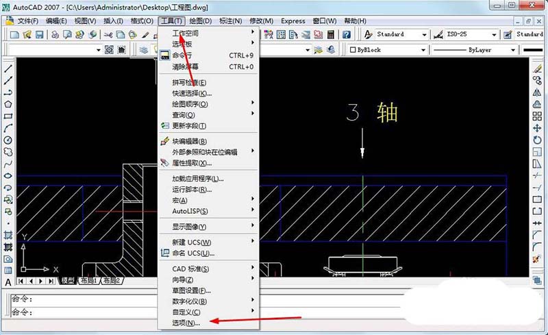 2、进入AUTOCAD后点击工具再选择选项按钮,如图所示;