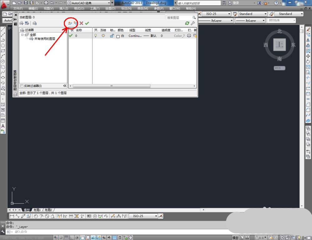 1、打开AutoCAD 2013软件,点击【图层特性管理器】,点击【新建图层】,将图层命名为:五节铁柜。点击色块,按图示设置一个图层颜色,完成五节铁柜图层的设置(如图所示);