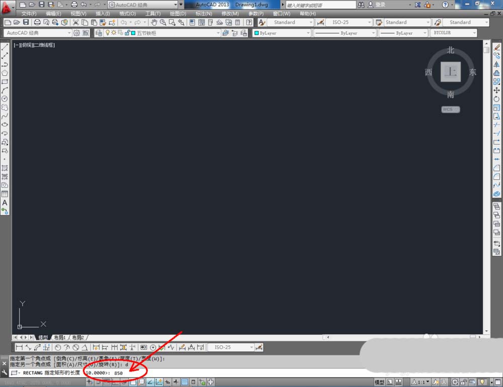 2、点击【矩形工具】,按图示在命令栏输入:d并按下空格键,输入长度数值:850并按下空格键,继续输入宽度数值:390并按下空格键,完成矩形图案的绘制(如图所示);