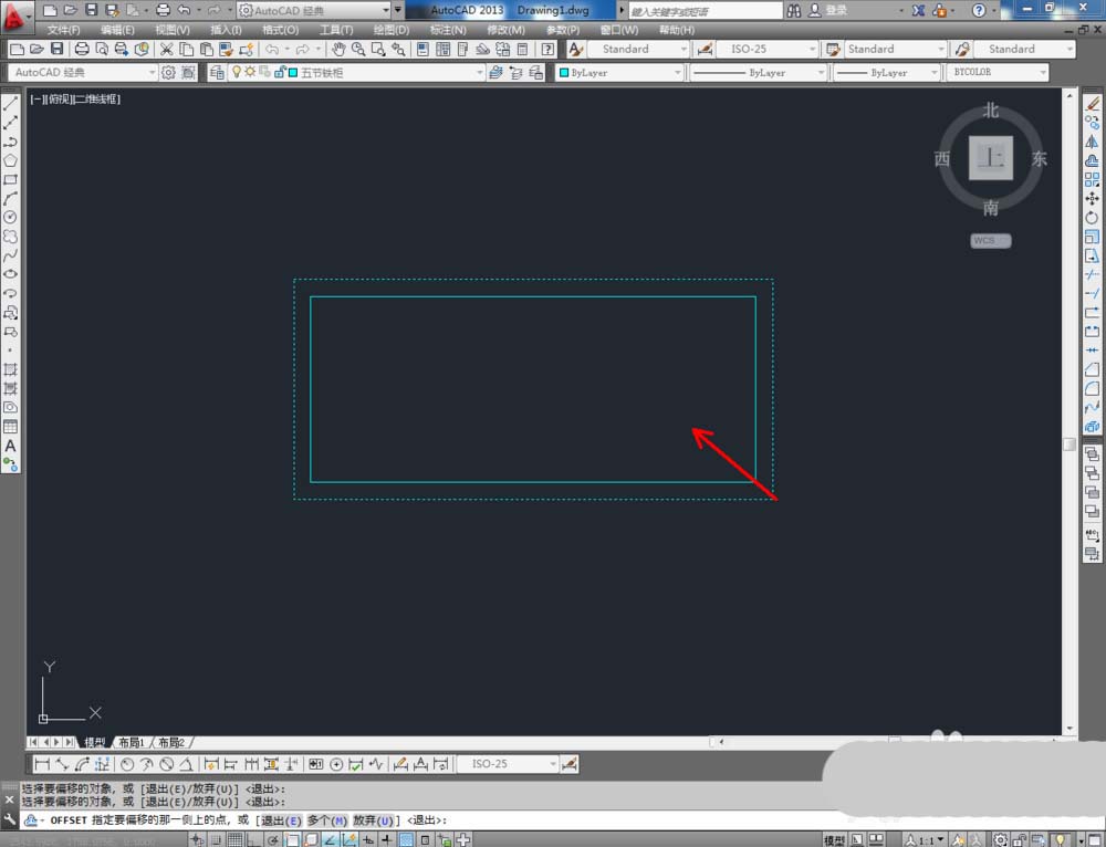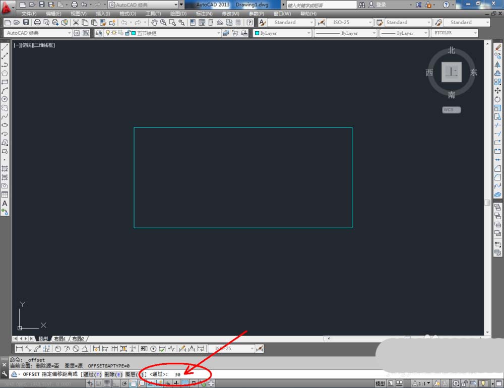 3、点击右边工具栏中的【偏移】,在命令栏中输入: 30,对矩形图案进行向内偏移 。点击【直线工具】在图示位置绘制一条直线线段(如图所示);