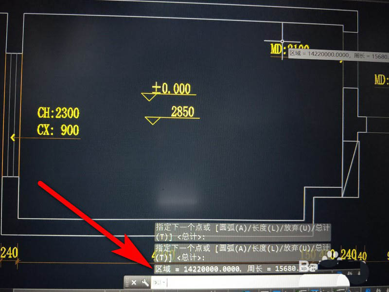 8、点击 两次空格键 就可以看到下方箭头的显示。区域=14220000 换算一下就是14.2㎡
