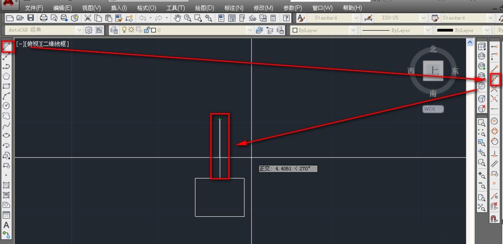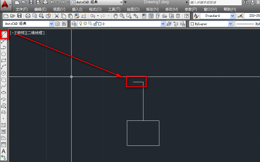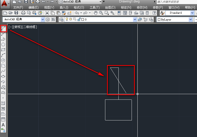 4、关闭正交,使用直线工具,绘制一条斜线,如下图。