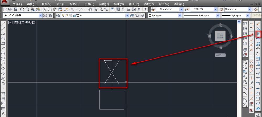5、使用镜像工具,镜像出另外一条斜线,如下图。