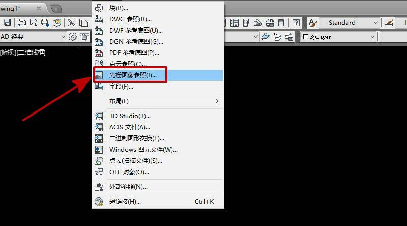 2、选择“光栅图像参照”,如图所示。
