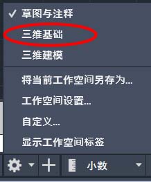 4、调出模式选择条形栏,默认勾选的“草图与注释”,选择“三维基础”