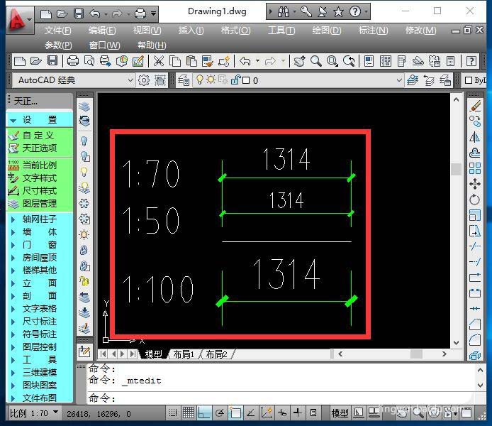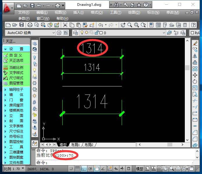 7、以上说的都是调整尺寸标注比例,但都是有一些常规的默认比例,如果希望按非常高比例标注,则只能在在天正主菜单“设置”下拉菜单中,选择“当前比例”,在下面的命令栏中输入要修改的比例样式,如1:70。