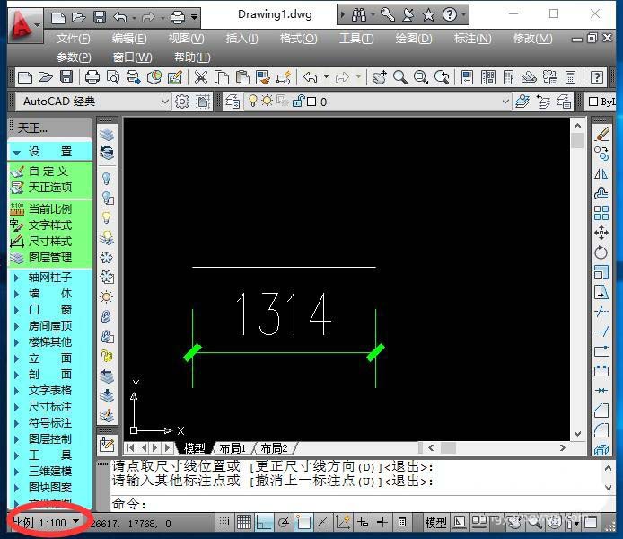 1、首先以CAD默认比例绘制一段直线,用天正的尺寸标注功能标注尺寸,界面左下角可见当前绘图比例为1:100。