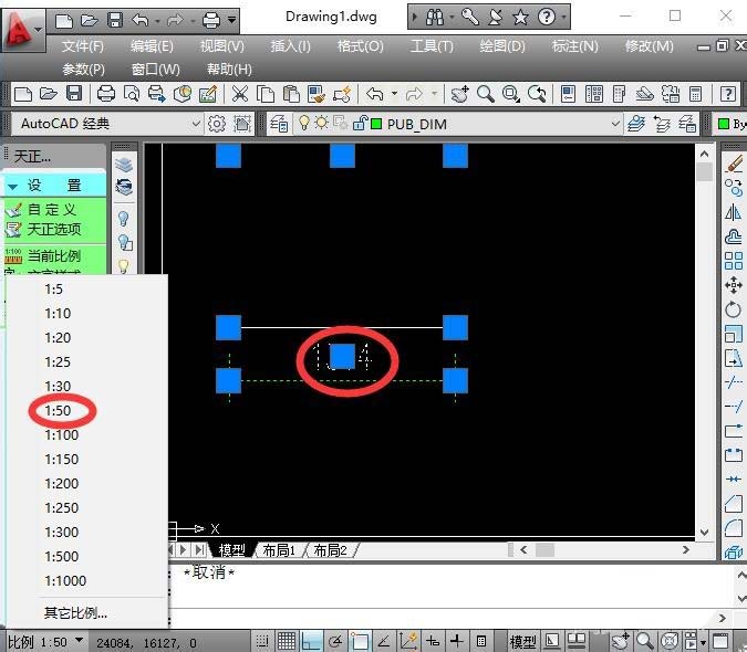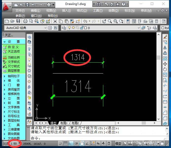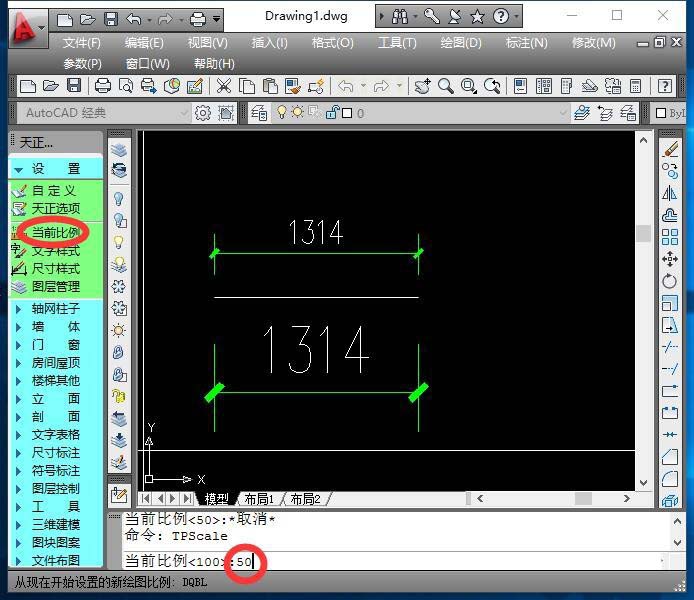 6、还有另外一种方式,即在天正主菜单“设置”下拉菜单中,选择“当前比例”,可在下面的命令栏中输入要修改的比例样式,如1:50。