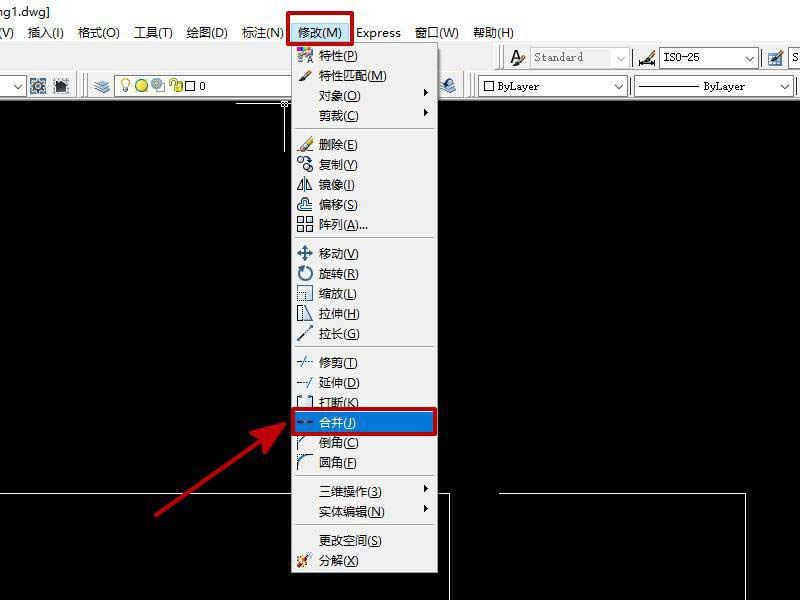 5、如果两条线段在同一水平线上,则点击”修改“,选择”合并“。