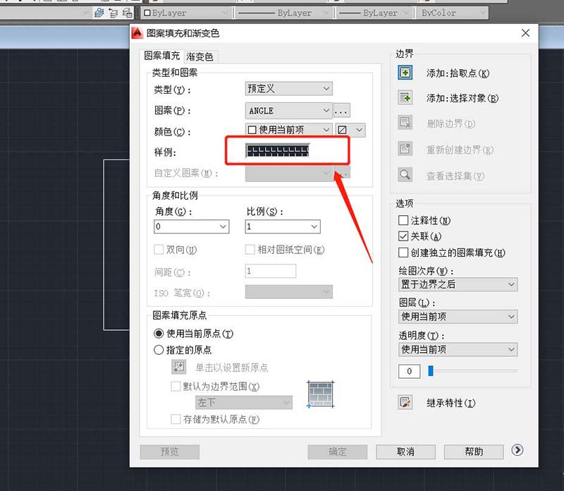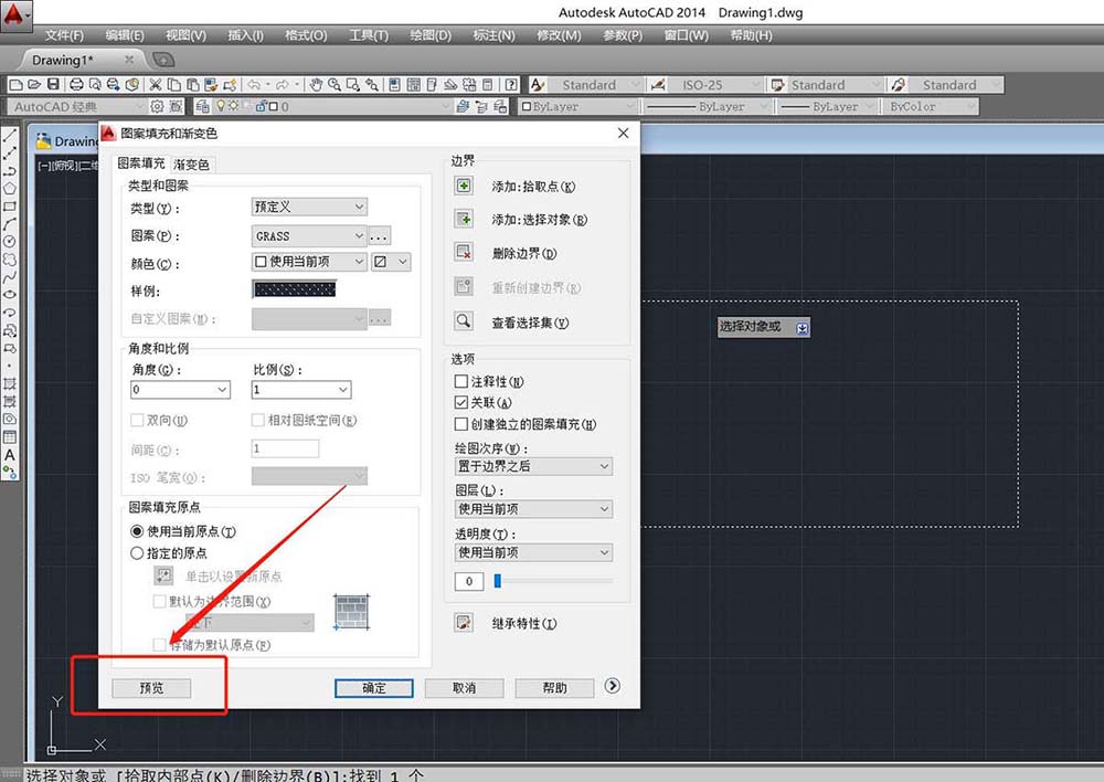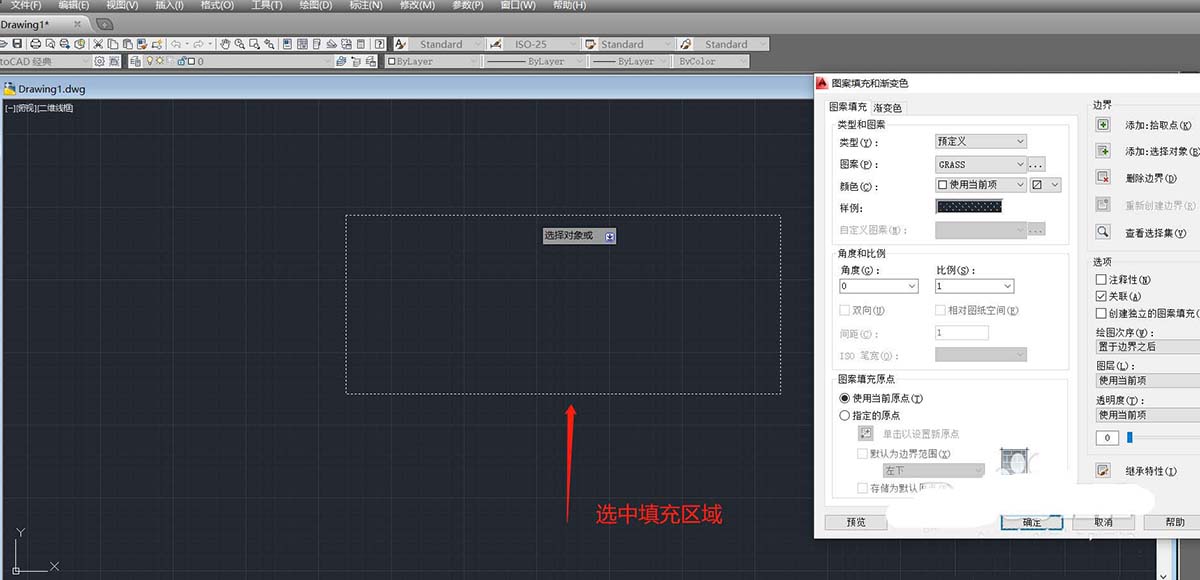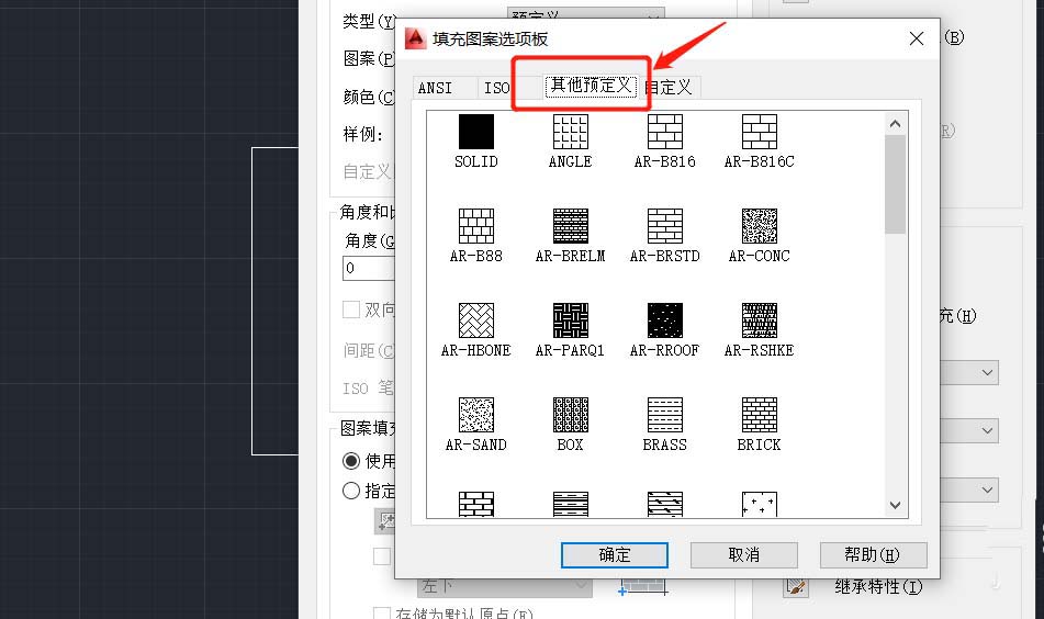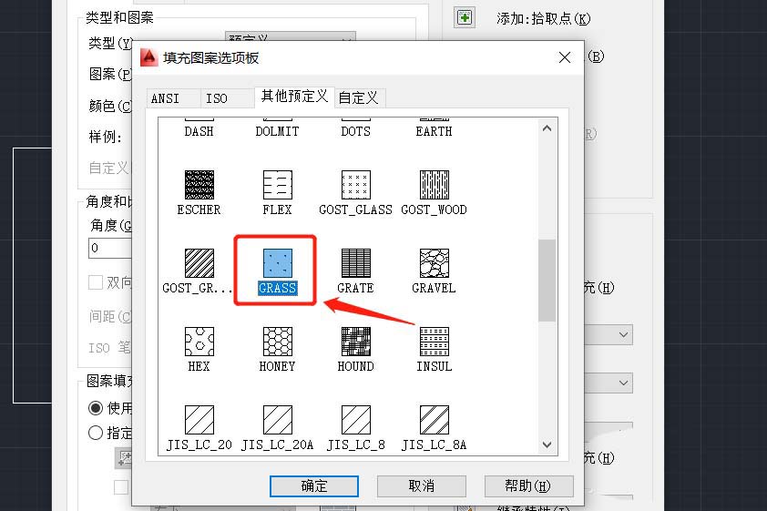 5、在弹出的图案填充选项板中,滑动鼠标中键找到GRASS图例(中文就是草的意思),并点击确定。