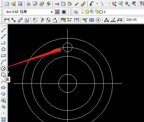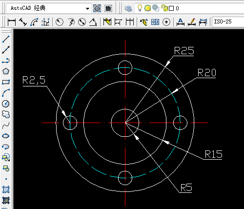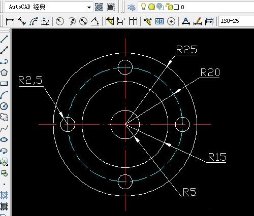 5、用圆工具,在直线和圆相交处为圆心绘制一个半径为2.5的小圆。再用复制工具复制三个小圆。