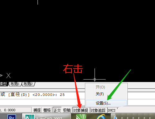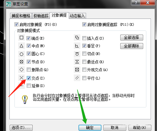 4、右击对象捕捉选设置,对话框中选交点,单击确定。