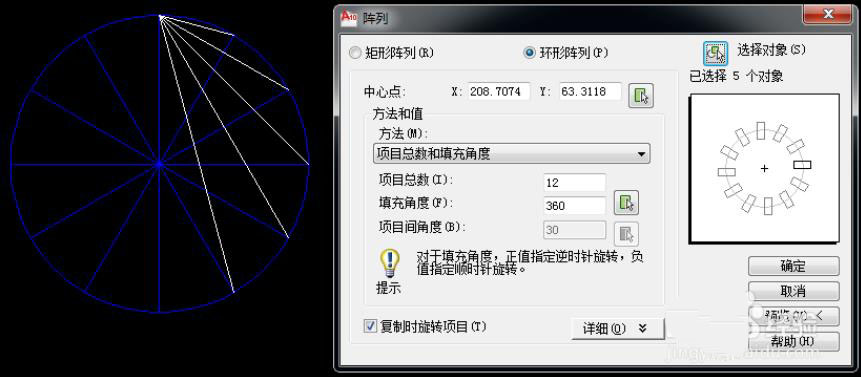 使用环形阵列,将竖直方向半径作环形阵列处理,即可等分圆形。
