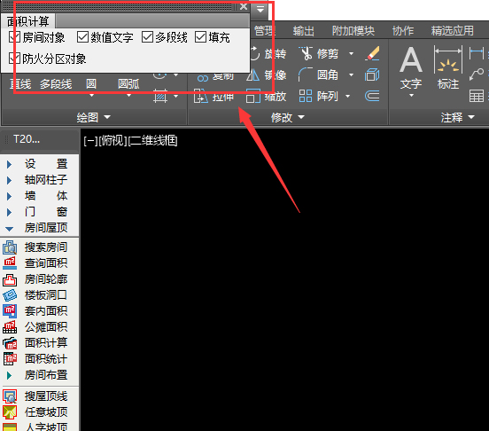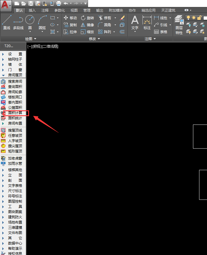 2、找到“房间屋顶”,点击“面积计算”按钮,然后就会出现面积计算的选项;