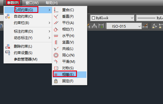 3、在菜单栏里面依次找到:参数——几何约束——相等。