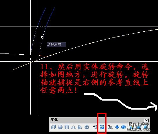 四、我主要用图来说明吧,一看就明白了。希望不会做的朋友比照着做做就懂了。这个例子其实是来展示"实体旋转"的功能,除此这外,一个重要的东西一定要掌握,就是"面域",我前面这样那样的工作都是为了创建出三个面域而做的。可以刚开始会感觉线条很乱,其实不用担心,最后一并删除。后面我就不多打字了,相信看了图都能够明白。