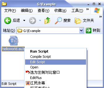 我们已经创建了脚本文件了,现在要做的就是对此脚本进行编辑使其具有我们需要的功能。在helloworld.au3这个脚本文件上点击鼠标右键然后在菜单中选择Edit Script。