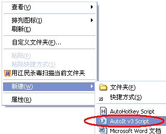首先打开你要创建脚本的文件夹,点击鼠标右键然后在菜单中选择 新建 / AutoIt v3 Script 。