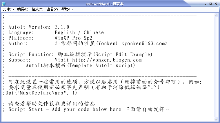 把脚本文件命名为helloworld.au3。注意扩展名应为.au3——这说明该文件是 AutoIt v3 脚本。