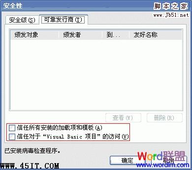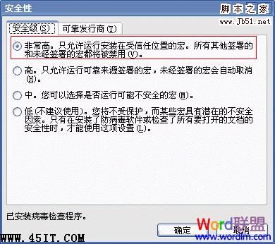 ①打开Word窗口,依次打开菜单栏的“工具”-->宏-->安全性; ②在弹出菜单中选择第一选项“非常高。只允许运行安装在受信任位置的宏。所有其他签署的和为经签署的宏都将被禁用。”;
