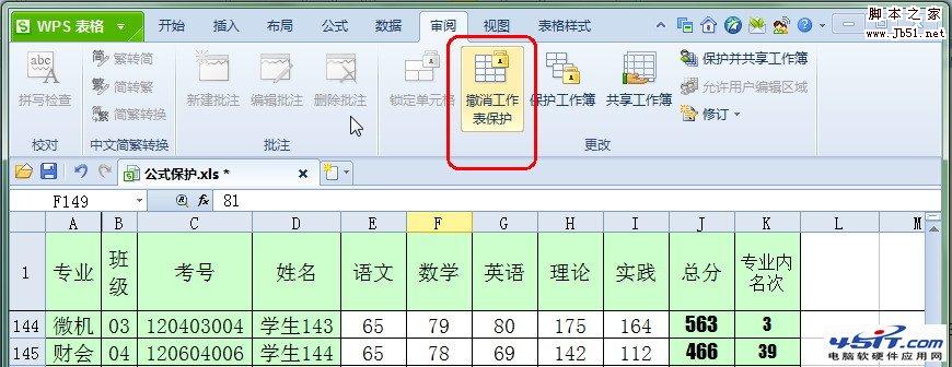 实际应用中发现,由于各种原因,老师在录入分数时经常会改动原有的表格,有时甚至会改变公式,使得最终的统计结果混乱不堪,甚至出错。因此,需要将涉及公式的那些单元格保护起来,只允许各老师录入相应科目成绩,其它单元格则不能做任何改动。