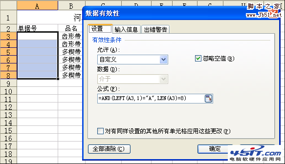 如果用户为了统一产品编号的输入,要求录入者只能输入8位的字母“A”开头的编号,同样也可以通过“数据有效性”来进行控制,设置步骤如下: