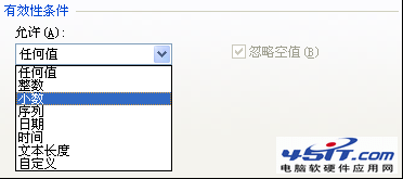 第3步:点击 允许 下拉按钮,从弹出的选项中选择 小数 。(如果分数值是整,此处可以选择整数)
