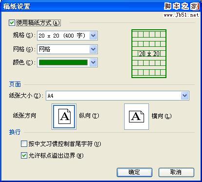 文字,然后在空白页面的菜单栏中单击“页面布局——稿纸”命令,在打开的“稿纸”对话框中勾选“使用稿纸方式”,并在“稿纸”对话框中选择好相应的规格、网格、颜色、纸张大小、纸张方向等(如图