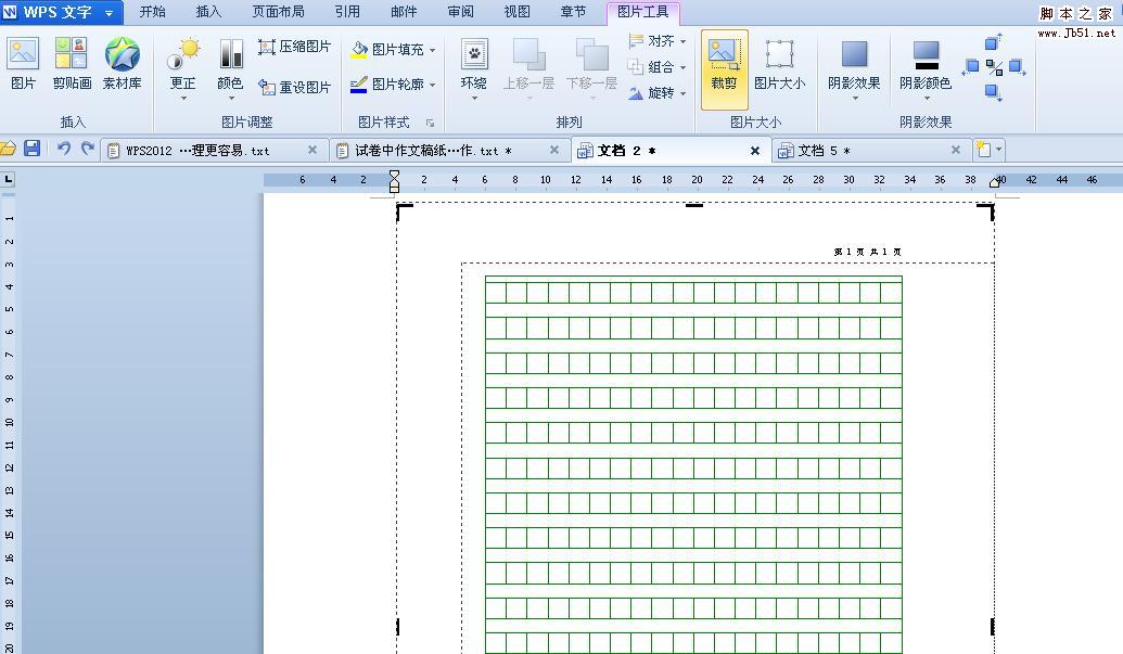 在试卷中我们需要的并不是一整页的稿纸啊?怎么办?首先在文档中单击我们插入“稿纸”对象使呈可编辑状态,然后在菜单栏中单击“图片工具——剪裁”命令,将鼠标指向图片的剪裁按钮并拖动鼠标(如图