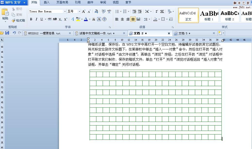 ),之后在打开的“浏览”对话框中打开刚才我们制作、保存的稿纸文件,单击“打开”关闭“浏览对话框返回“插入对象”对话框,并单击“确定”关闭对话框。至此,一页稿纸就插入到试卷中了(如图