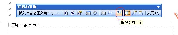 点击“页眉和页脚”工具栏中的“链接到前一个”图标,页脚右上角的“与上一节相同”消失。
